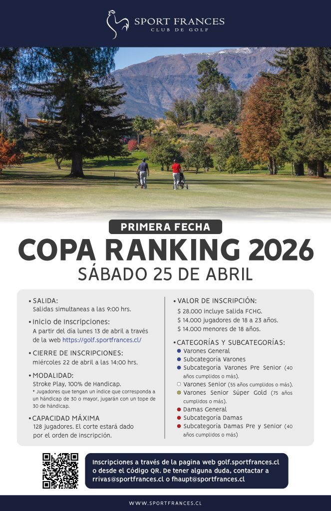 El próximo sábado 25 de abril se disputará en el Club de Golf Sport Francés la Primera Fecha de la Copa Ranking 2026, torneo que reunirá a jugadores en una jornada de competencia bajo la modalidad Stroke Play (100% de hándicap).