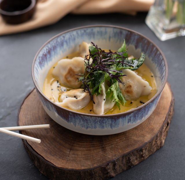 Gyosas artesanales de cerdo y verduras en cocción mixta (vapor – salteada) sobre crema tibia de huancaína y ciboulette fresco con dúo de sésamo.